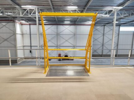 Plateforme de stockage 7x7m, capacité de charge 500 kg/m², avec escaliers, garde-corps et point de transfert