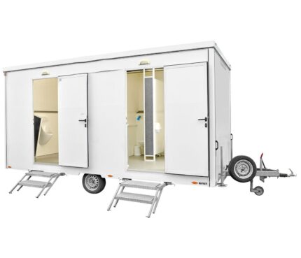 La remorque WC utilisable de manière autonome, pour tous les cas où aucun raccordement d’arrivée et d’évacuation d’eau n’est pas disponible. Capacité pour 70 à 80 personnes max.