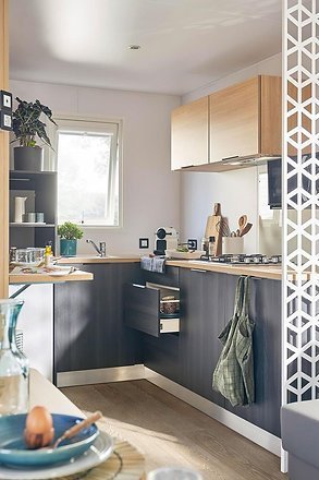 Die Originalität dieses neuen Mobilheims ist die nach hinten versetzte Küche, die Ihnen zweifellos gefallen wird. Diese Anordnung ermöglicht einen luftigeren Raum und trennt die Küche besser vom Wohnzimmer. An Ausstattung fehlt es an nichts: 4-Flammen-Kochfeld, Edelstahlspüle, versenkbare Arbeitsplatte, Rauchmelder, Stauraum. Auch das Wohnzimmer ist komplett ausgestattet für Momente der Geselligkeit und Entspannung.
