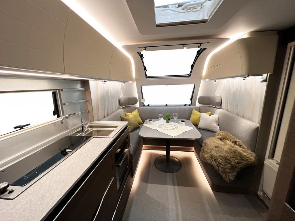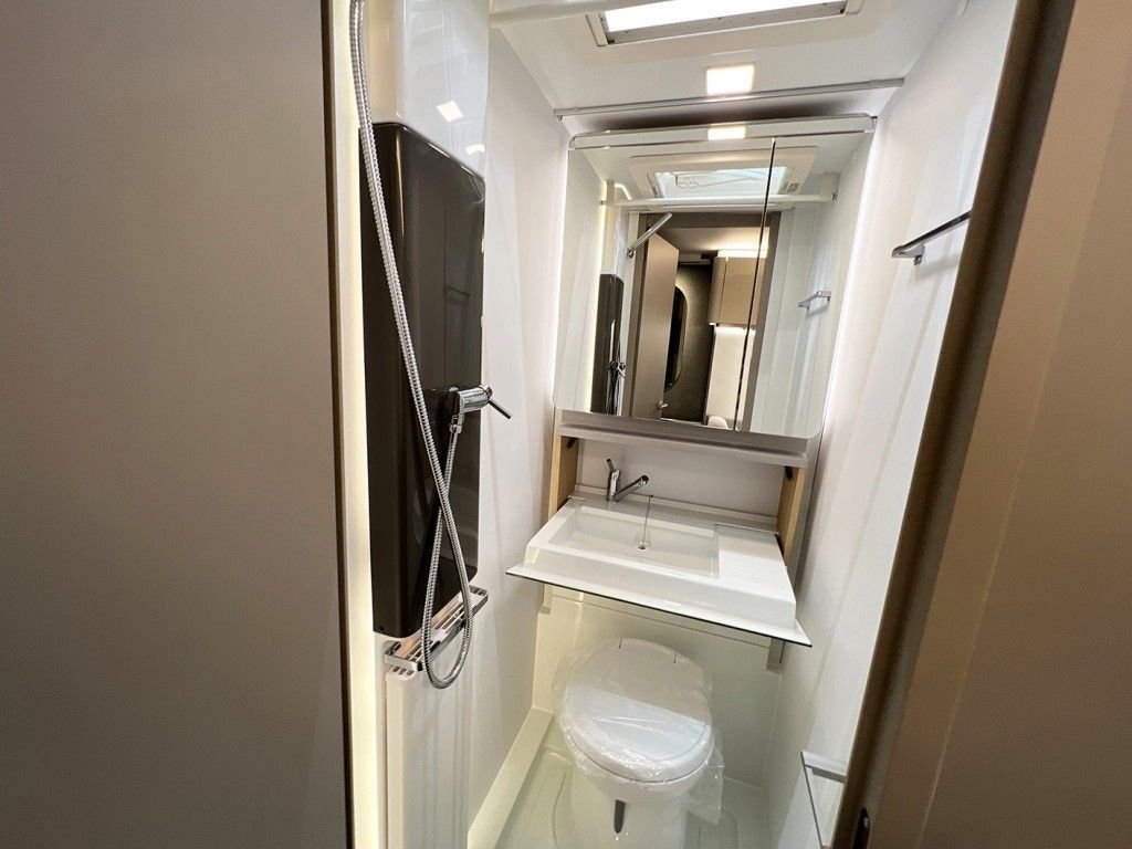 Voiture familiale très appréciée et complète avec une chambre d’enfants à l’arrière, composée de 3 couchages et d’un coin salon cosy. Salle de bain avec WC et douche, ainsi qu’un lavabo rabattable et un lavabo design sur le siège extérieur des toilettes à côté du lit double. Le coin cuisine est bien équipé et dispose de nombreux rangements, d’un grand réfrigérateur avec compartiment congélateur séparé, d’un four, d’un micro-ondes et de 3 plaques électriques. Le salon lui-même est situé à l’avant sous la grande lucarne.