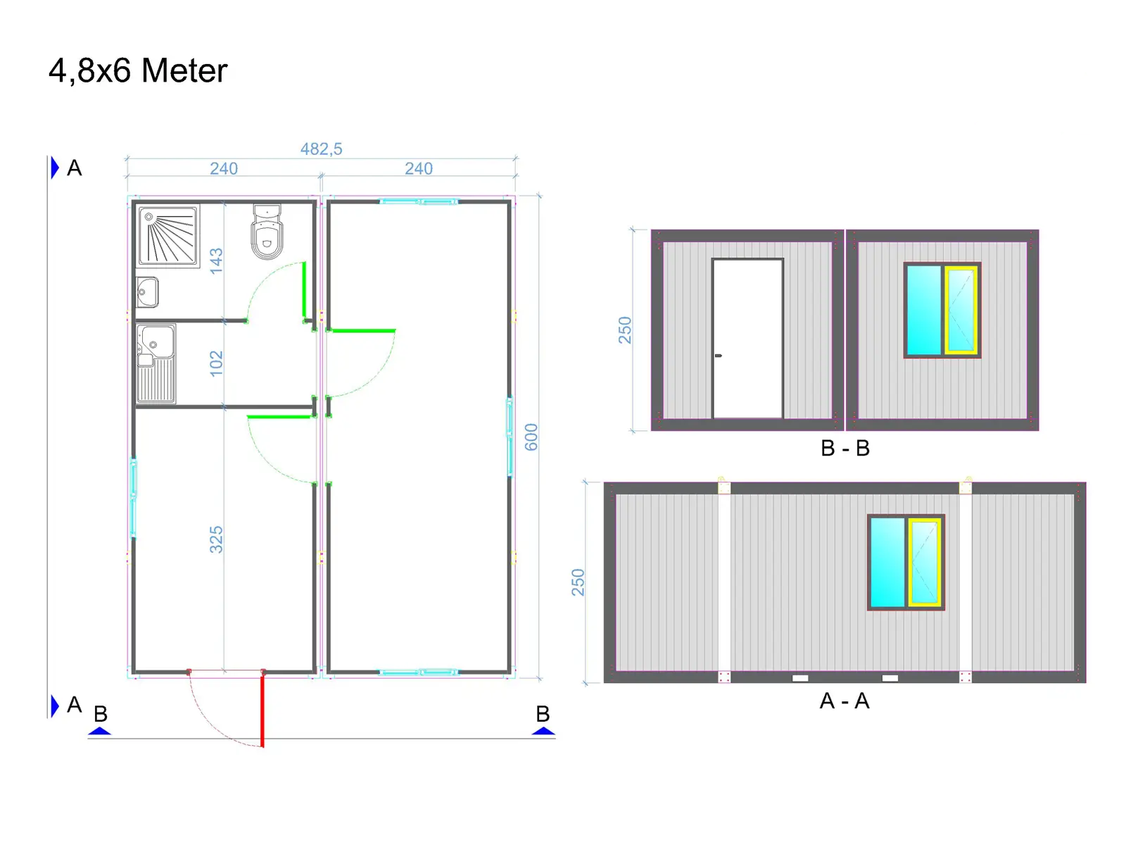2x chambre, 1x porte d’entrée, 1x porte intérieure, 4x fenêtre, 1x toilette avec lavabos, 1x douche, 1x cuisine