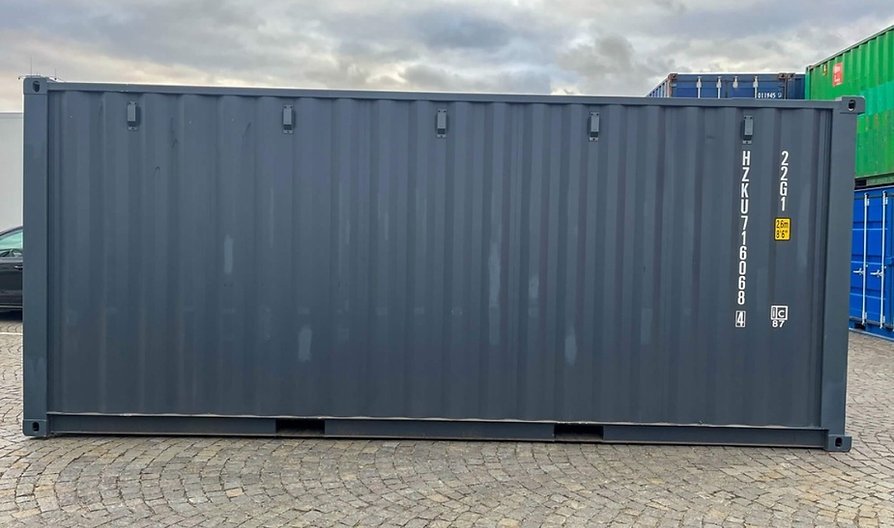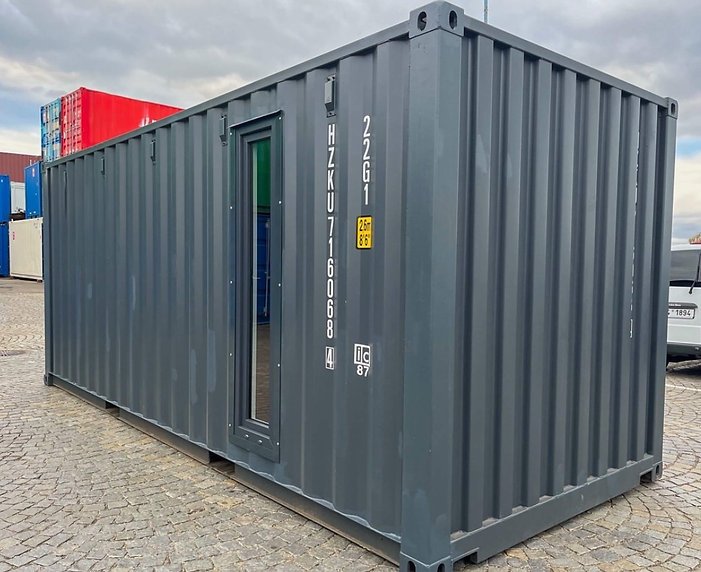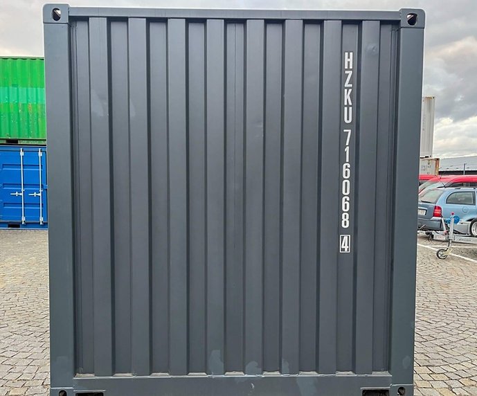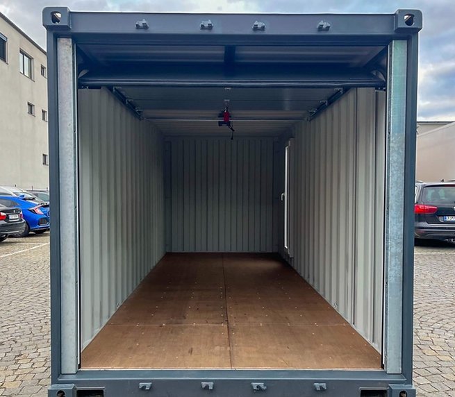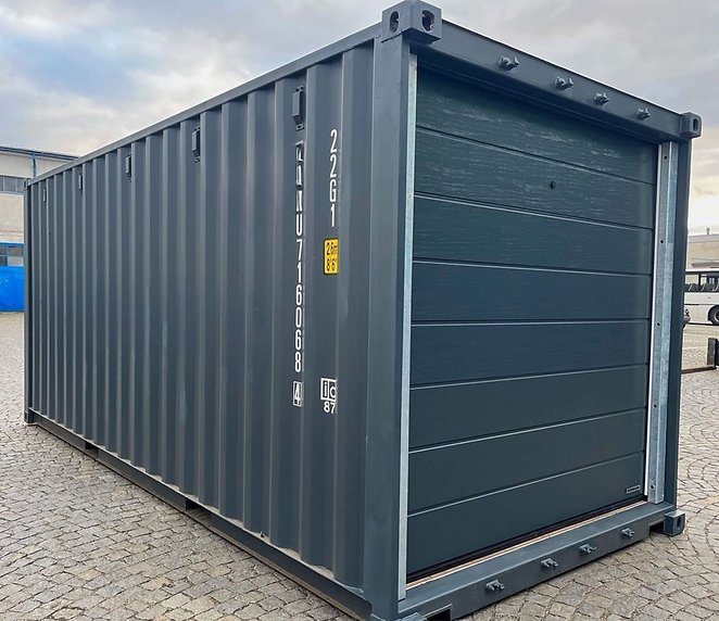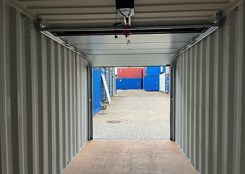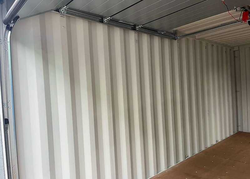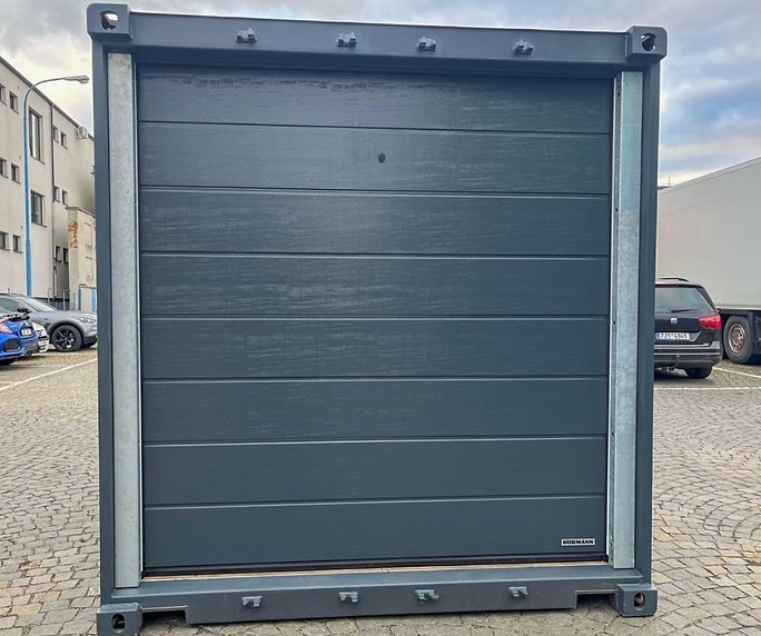 La structure de base est un conteneur maritime ISO en acier corten, robuste, résistant aux intempéries et durable. Il est équipé d’une porte sectionnelle Reno Matic de dimensions 2 140 x 2 250 mm, finition Woodgrain de couleur RAL 7016 (gris anthracite), avec entraînement électrique, barre ProLift + M et deux télécommandes. La porte dispose également d’un système d’ouverture d’urgence par clé en cas de panne de courant.