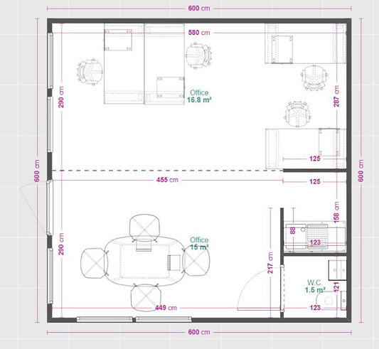 Conteneur social de bureau 6 × 6 m -36 m² avec WC et kitchenette