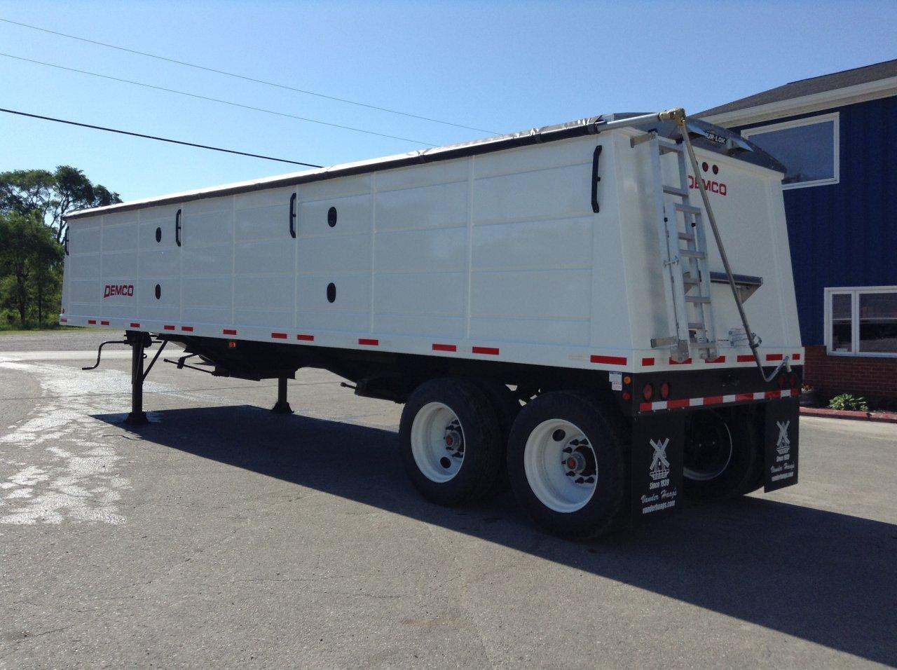 Remorque céréalière en acier Demco 2025 de 34 pi x 96 po – Hauteur latérale de 66 po, suspension à ressorts, essieu tandem, pneus 11R 22,5, roues en acier, deux trémies, volume de 1 152 pi³, boisseaux de niveau (environ) 922, boisseaux bombés (environ) 985, garde au sol de 25 po, ouverture de trémie de 30 po x 20 po, axe de 18 po, train d’atterrissage 55 à 2 vitesses, échelles et plateforme avant et arrière, barreaux d’échelle à l’intérieur de la remorque, fenêtre de surveillance, bâche manuelle, PNBV de 62 000, garde-boue, trémie ventilée, renfort Jake.