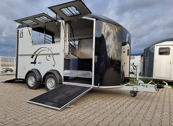 La remorque Cheval Liberté Maxi 3 est conçue pour transporter jusqu’à trois chevaux dans un confort et une sécurité optimaux. Grâce à sa rampe latérale pratique et sa sellerie intégrée, elle offre un espace bien pensé et durable pour vos déplacements.