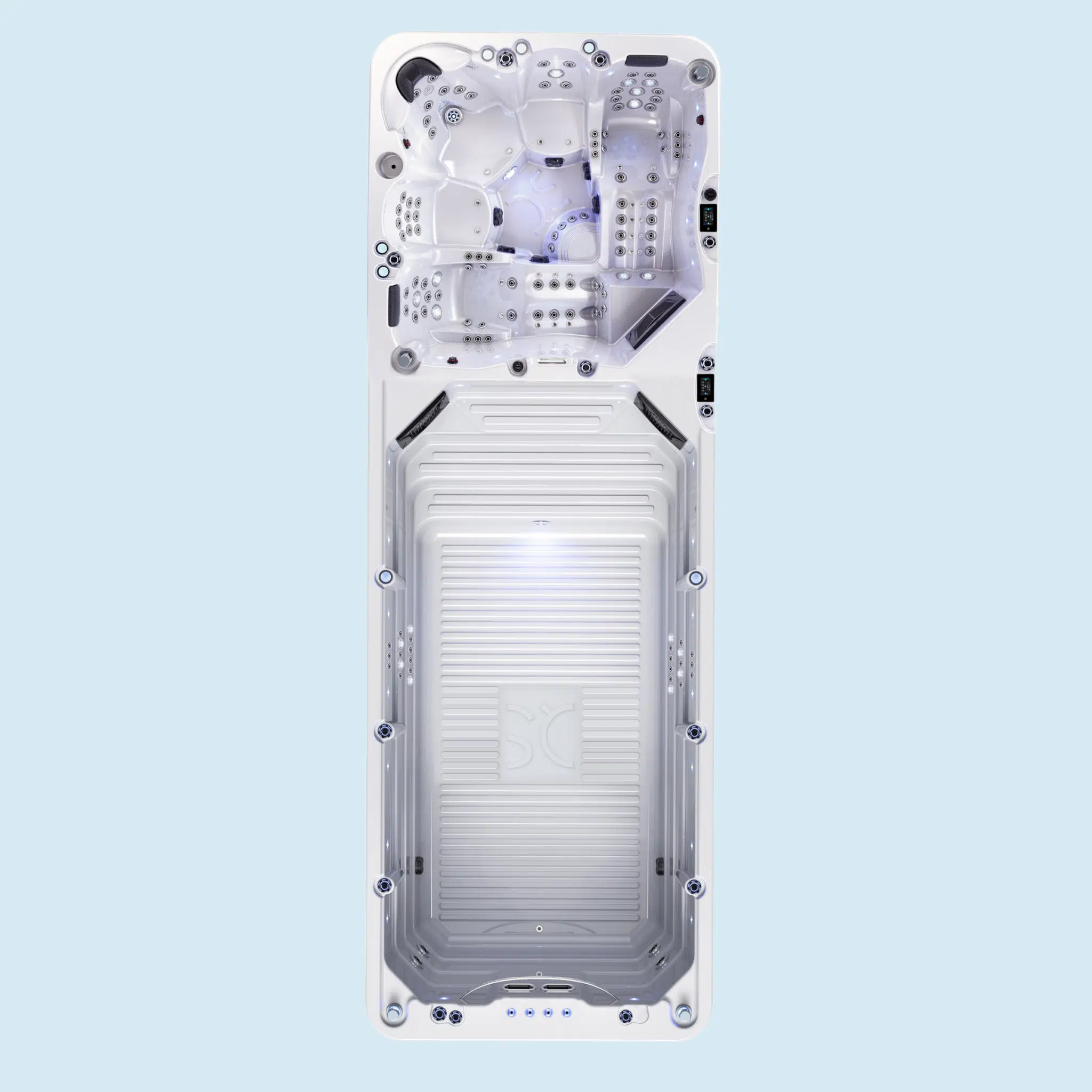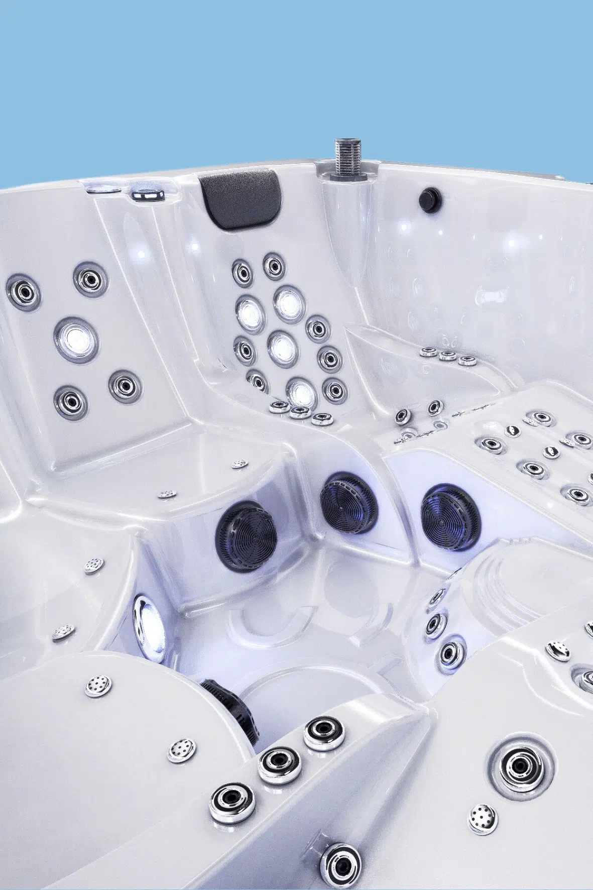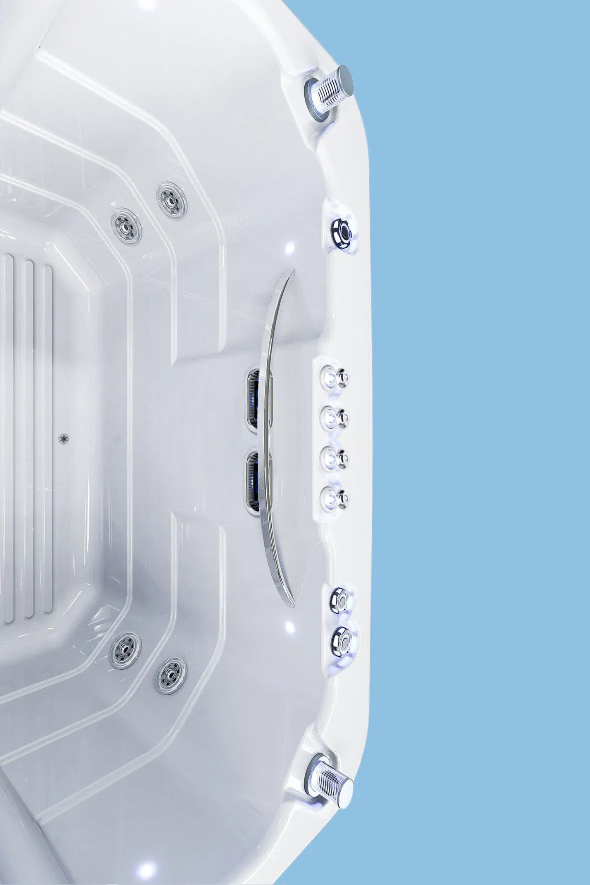Les finitions en acier chromé des buses et les poignées ergonomiques pour sortir renforcent son allure luxueuse. Confort ultime : appui-tête ajustable, leds chromothérapie, seau à champagne intégré, cascade lumineuse LED et aromathérapie.
